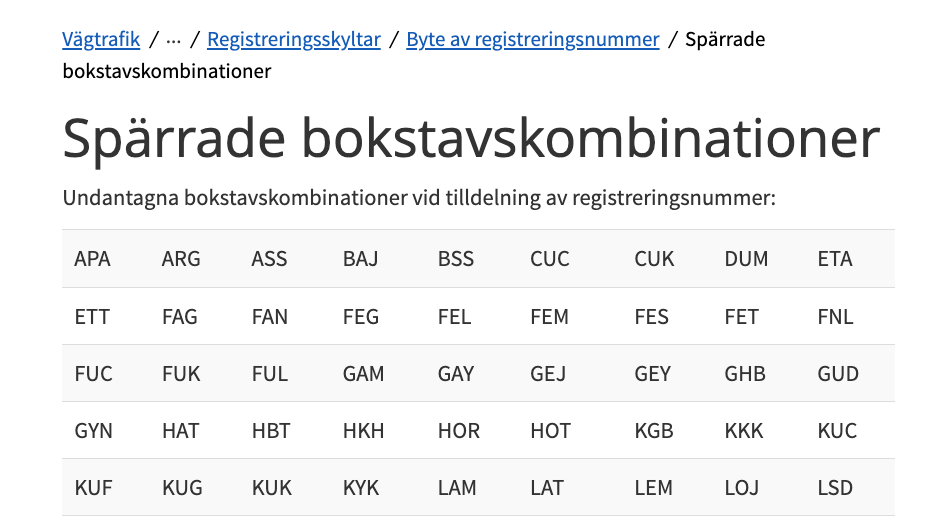 Här ser vi en del av kombinationerna som inte får användas som registreringsnummer. Skulle du köpa en sportbil med numret FUL001?
