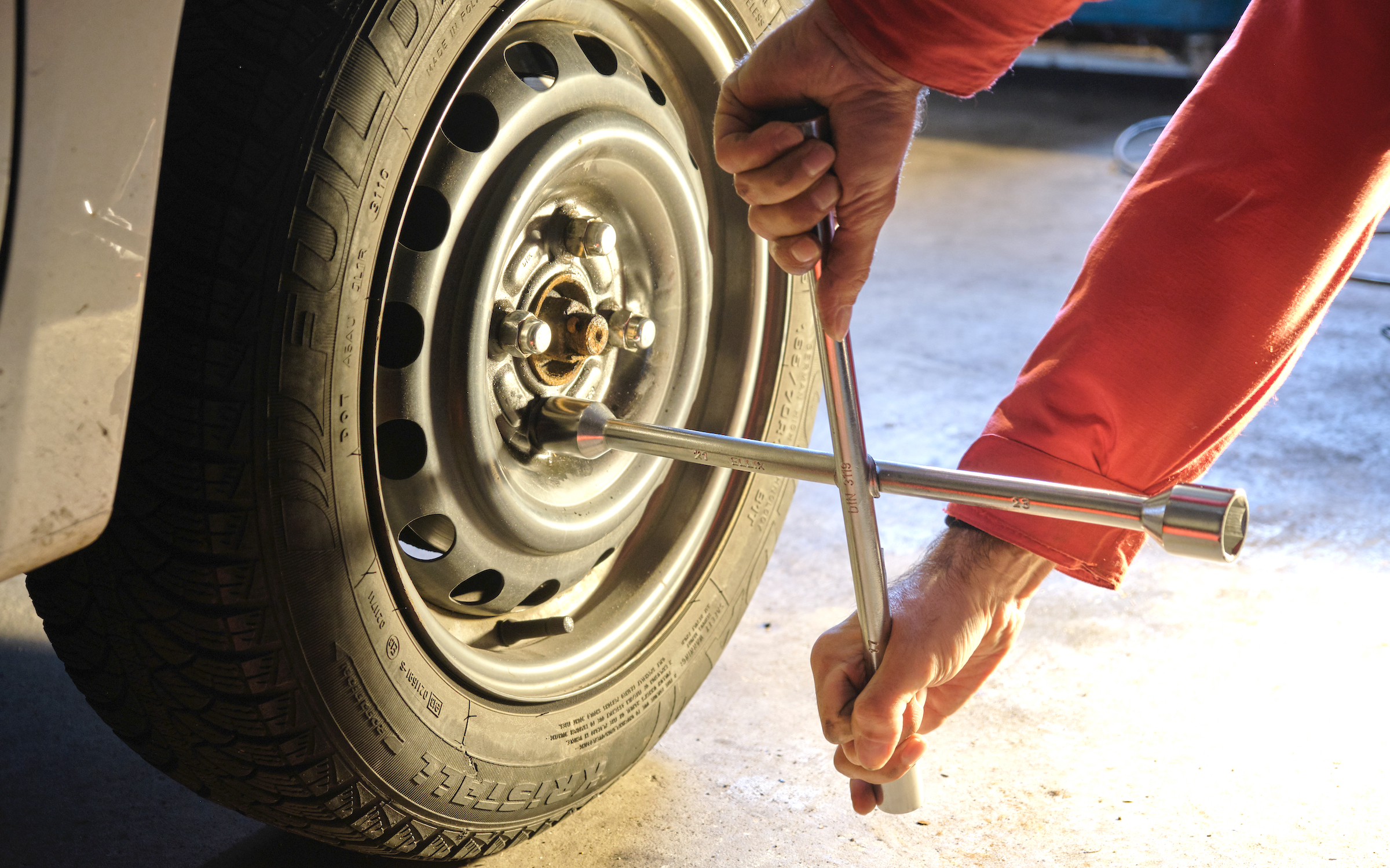 Ett fälgkors kan få duga för att efterdra hjulbultarna.