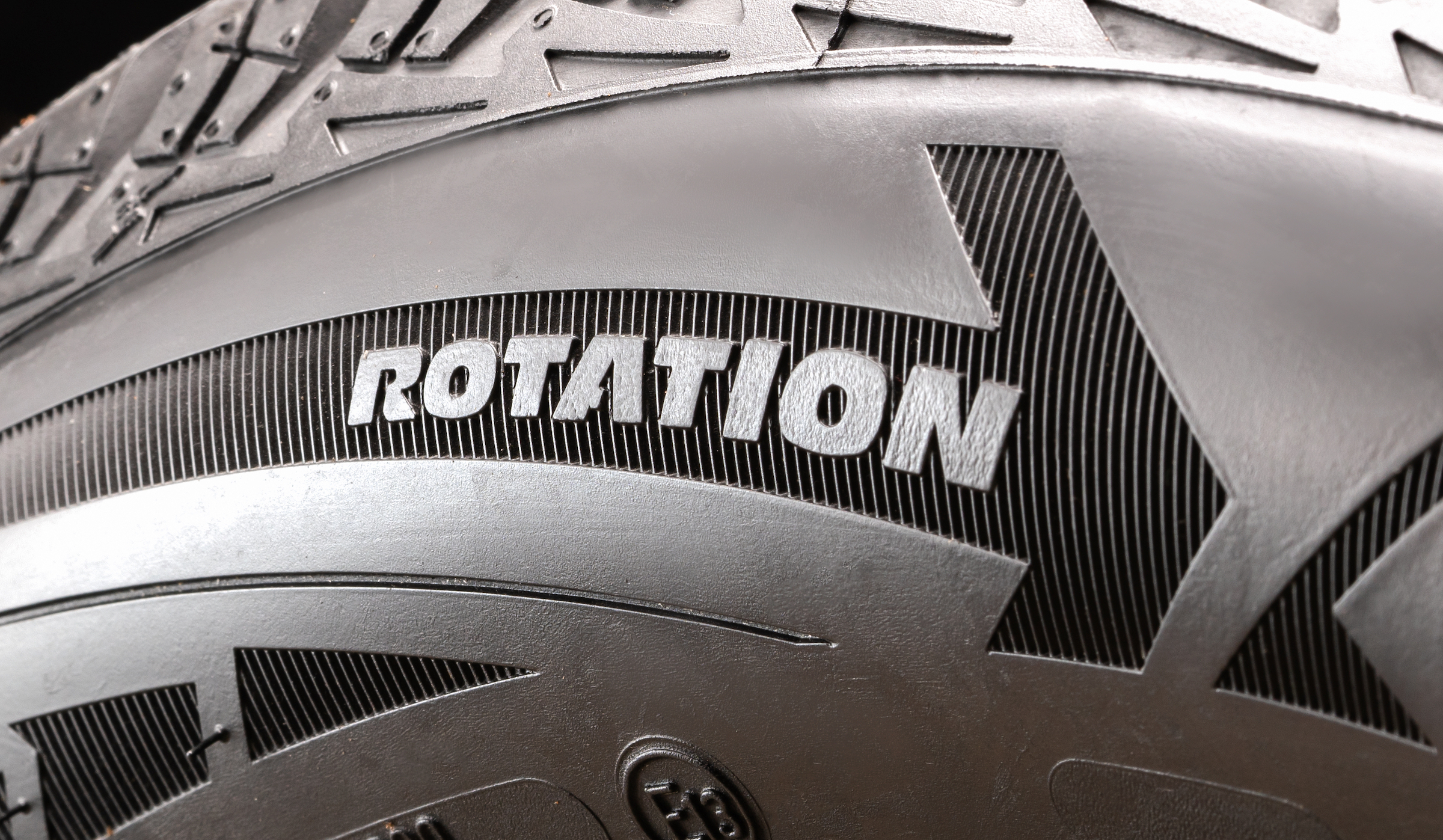 De flesta däck är rotationsbundna, de ska alltså snurra åt ett bestämt håll. Det brukar visas med en symbol, som den här stiliserade pilen. Med rotationsbundna däck har man två som bara kan sitta på vänster sida och två som bara kan sitta på höger sida.